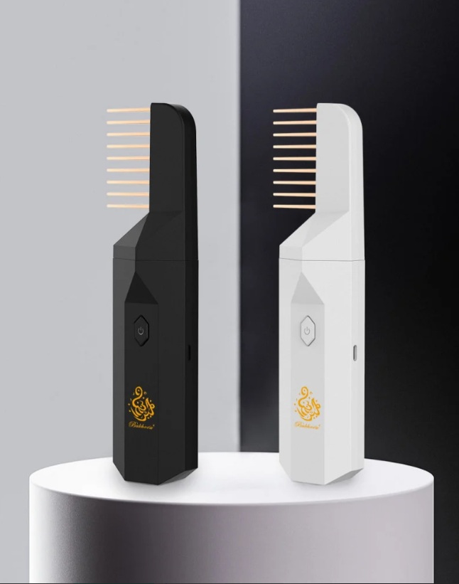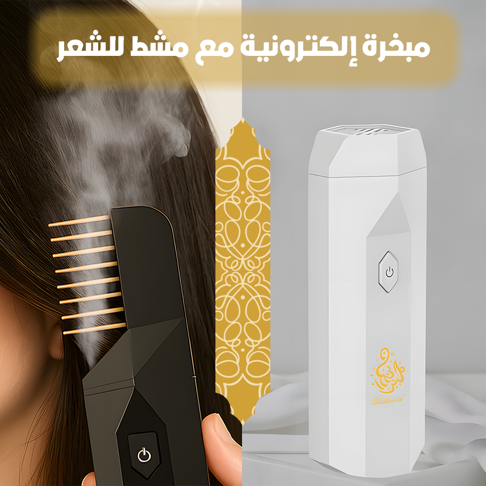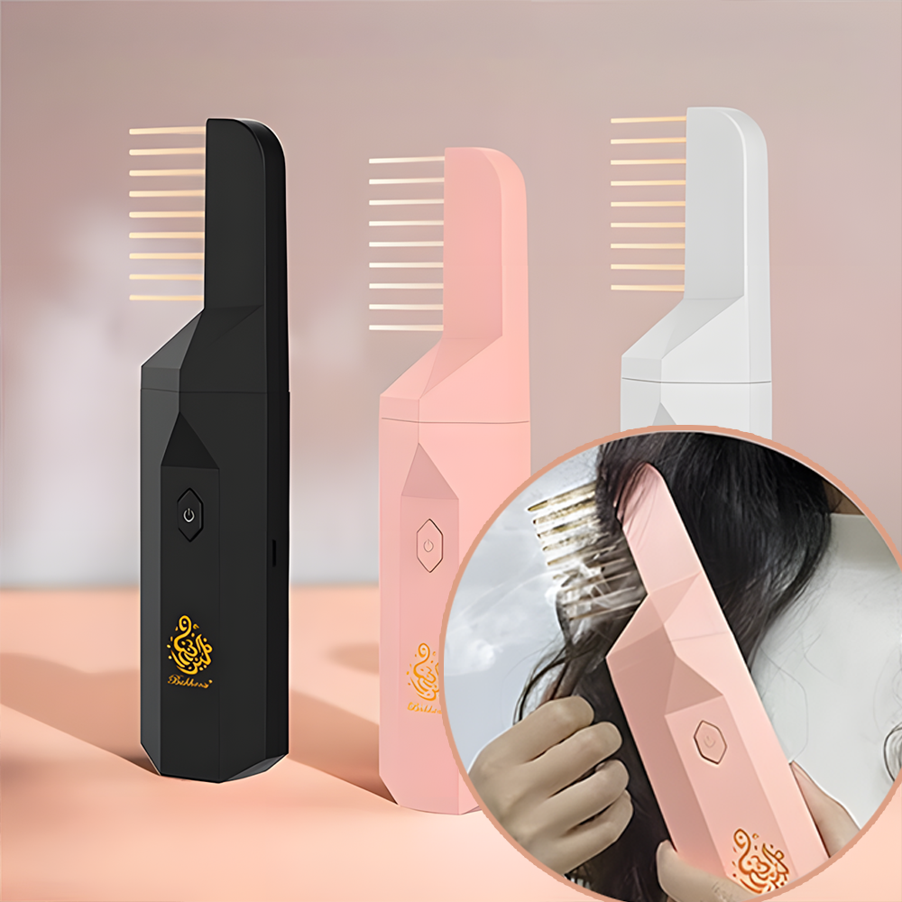 مبخرة شعر بتصميم جديد وأنيق، تتميز بمشط جانبي يتغلغل داخل خصلات شعرك بكل سهولة، ويزيد من ثبات رائحة البخور. كما يمكنك استخدامها لتبخير الملابس والسيارة.