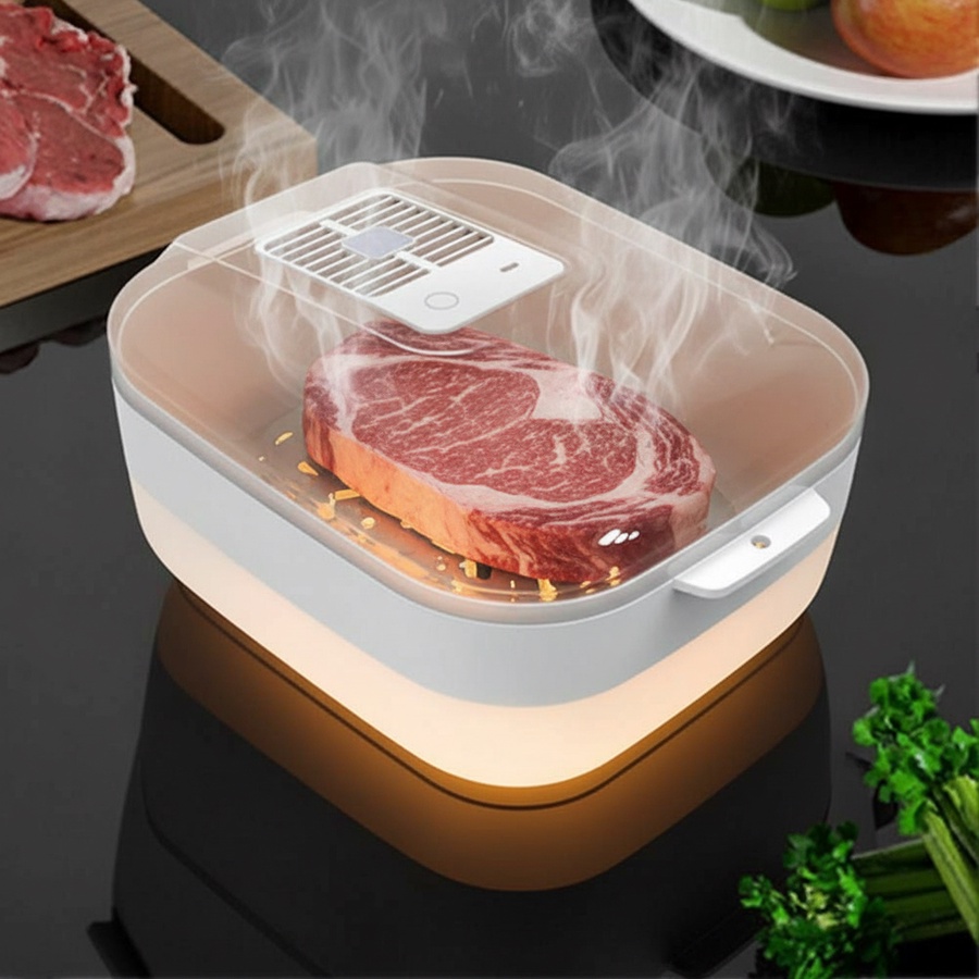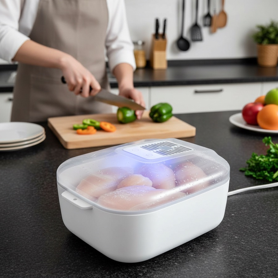 بتصميم فخم وأنيق يضيف لمسة رقي لمطبخك، صممنا هذا الجهاز عشان يكون أكثر من مجرد أداة عادية. هو مساعدك الشخصي اللي يجمع بين السرعة والنظافة والأمان التام. وبفضل تقنية الإذابة الحرارية الذكية، الجهاز يحافظ على درجة حرارة ثابتة تخلي اللحم يذوب بالتساوي وفي وقت قياسي، عشان يجهز للطبخ فوراً وهو محافظ على طراوته وعصارته وقيمته الغذائية كاملة.