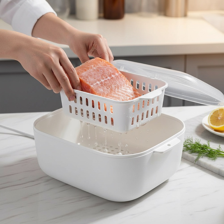صحتك وصحة عائلتك خط أحمر. الجهاز مصنوع من مادة البولي إيثيلين (PE) عالية الجودة والآمنة تماماً على الأكل، وهذا يضمن لك جهاز يعيش معك طويلاً. والأهم من كذا، فيه خصائص متطورة مضادة للبكتيريا تمنع نمو الجراثيم وقت فك التجميد، عشان تطبخين وأنتِ مرتاحة ومطمنة على سلامة وجباتك.