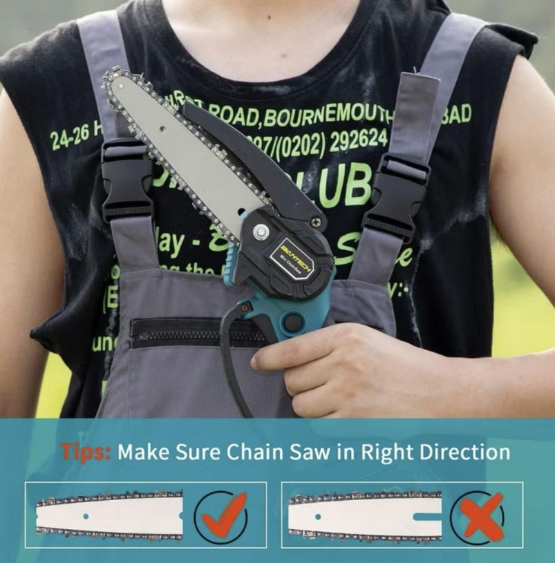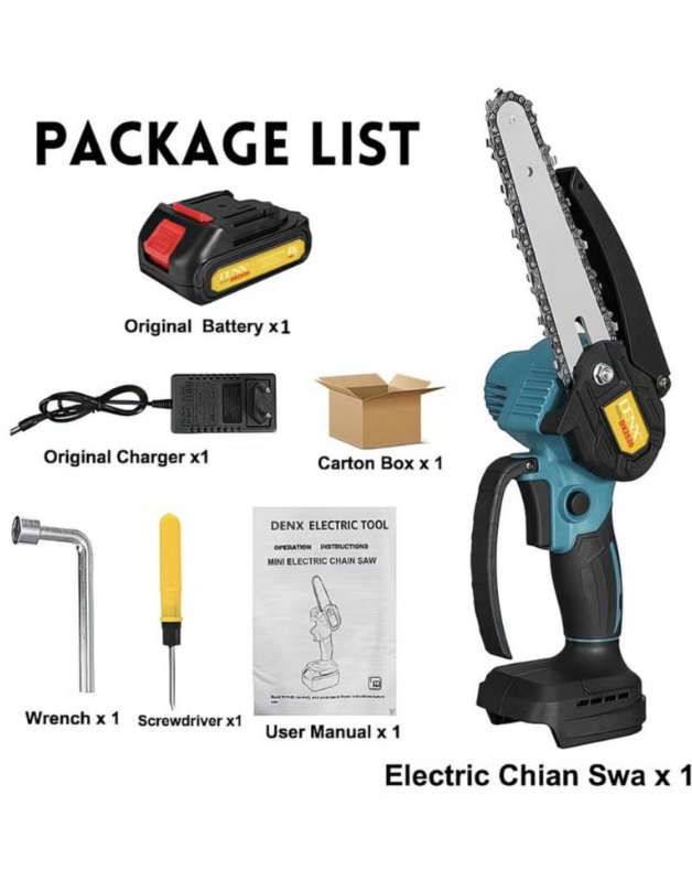 تركيب سريع ومريح في بضع خطوات بسيطة. حجم صغير لإمكانية الاستخدام بيد واحدة. تتضمن العبوة منشار جنزيري وسلسلة توجيه وبطارية وشاحن ومفك براغي ودليل الاستخدام ويأتي معه بطارية ليثيوم واحدة