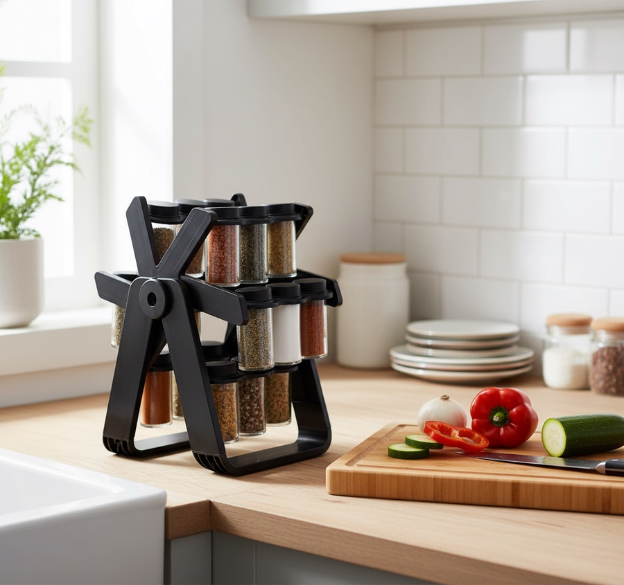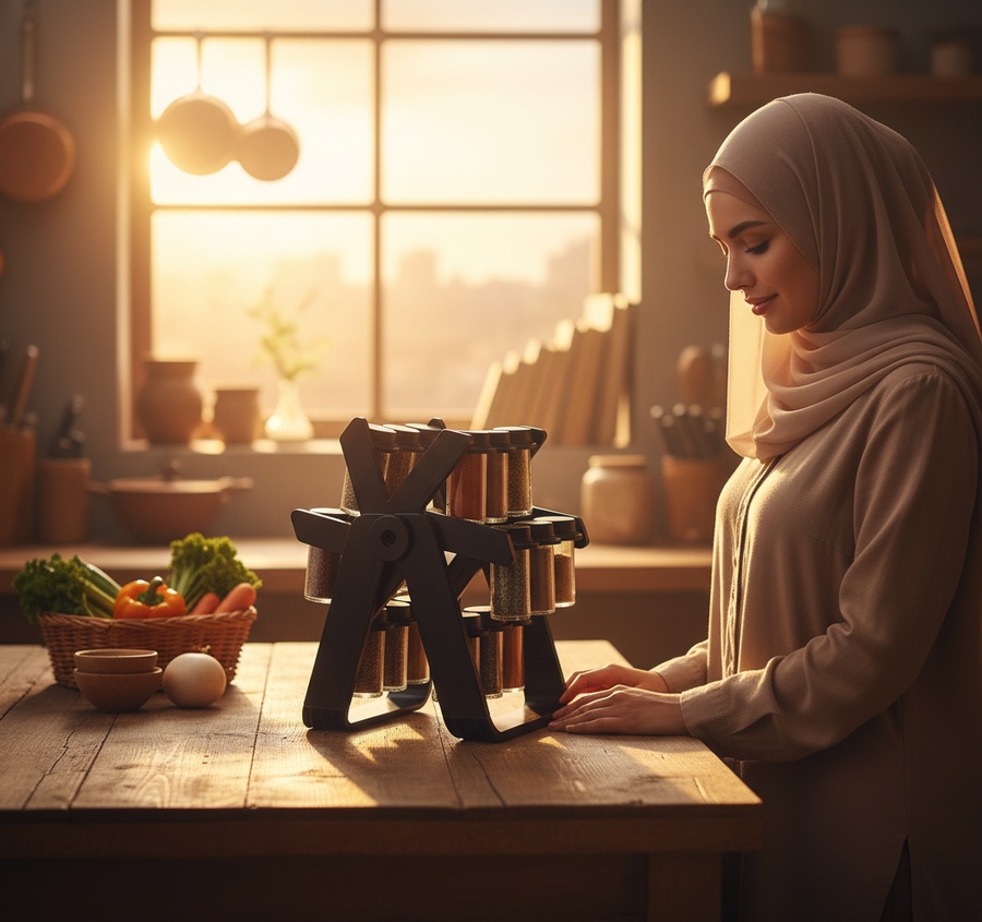 ● لفة وحدة وتوصلين للي تبين: دعامة دوارة متعددة الوظائف تلف 360 درجة، لفيها براحتك وخذي البهار اللي تحتاجينه بلمح البصر، بدون حوسة وتدوير.